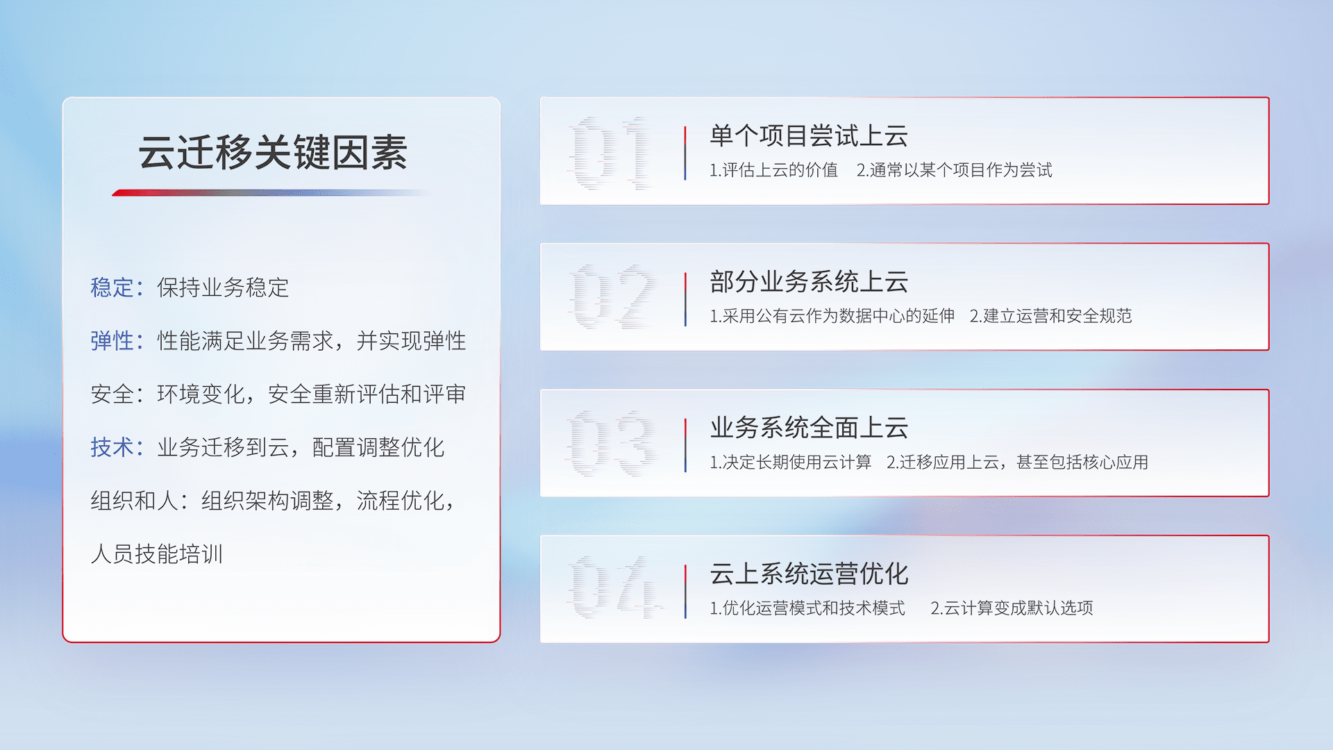 结合实际业务,,从规划设计、、云平台选型、、、、云原生改造、、、数据迁移、、、集成交付,,迁移全过程为客户识别最佳上云路径,,,做好风险识别管理,,设计网络架构、、身份权限、、、安全审计合规、、操作审计、、日志审计、、监控告警策略、、、多站点容灾设计等,,,,对云上基础设施进行整体规划,,提升IT治理水平,,,以满足弹性、、、高可用、、高性能的需求。。